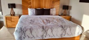 3 habitaciones, 4 camas matrimoniales, 2 en cada habitación y una king size en la habitación principal. 2 baños completos y uno medio.
