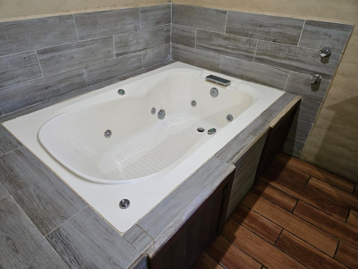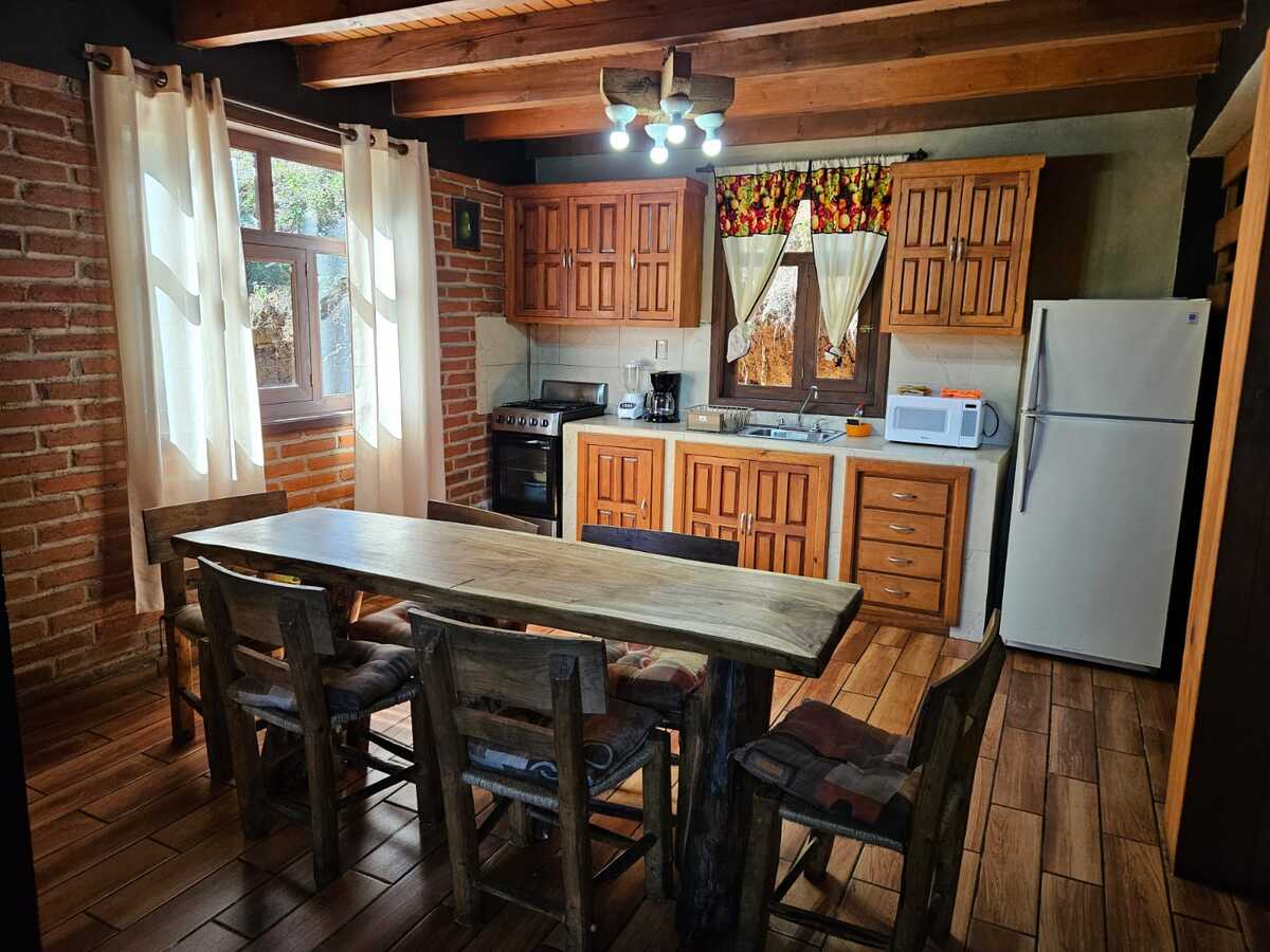 Comedor para 6 personas, cocina equipada, estufa de piso, refrigerador sin escarcha, horno de microondas, licuadora y cafetera.