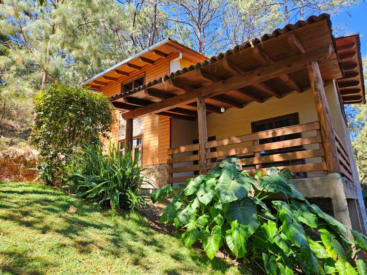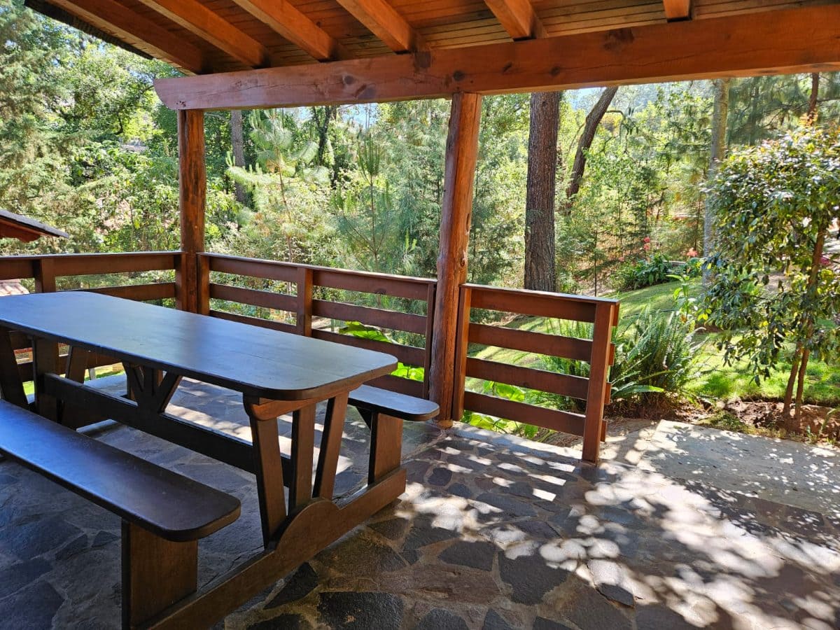 Terraza con banca y asador móvil, amplio estacionamiento al pie de la cabaña.