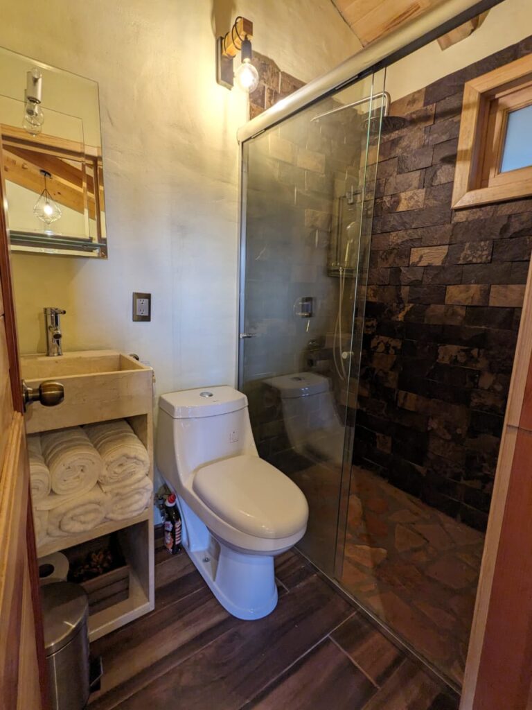 Baño muy limpio con toallas, batas, jabón, shampoo, crema y baño de burbujas para jacuzzi
