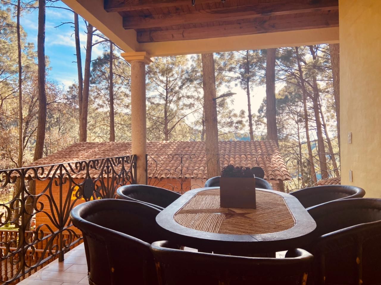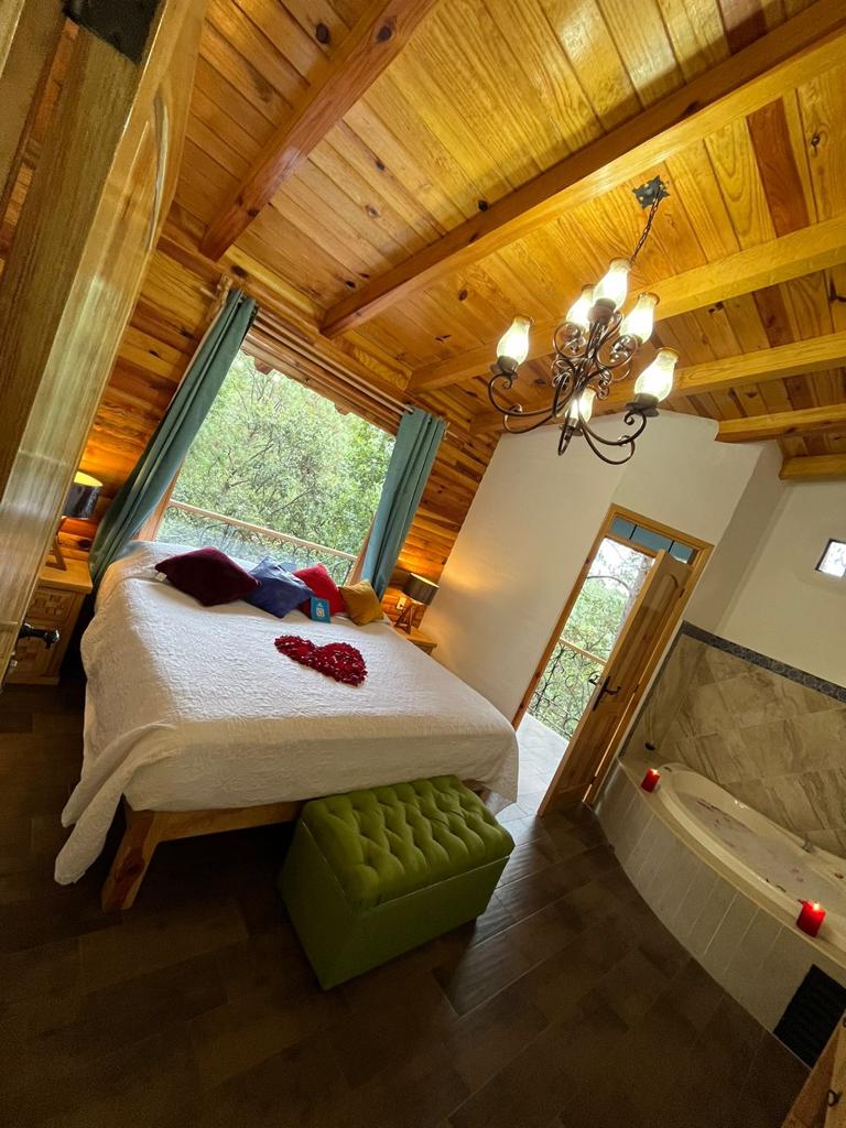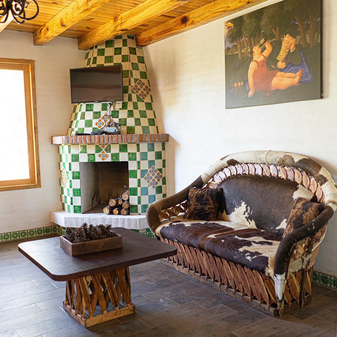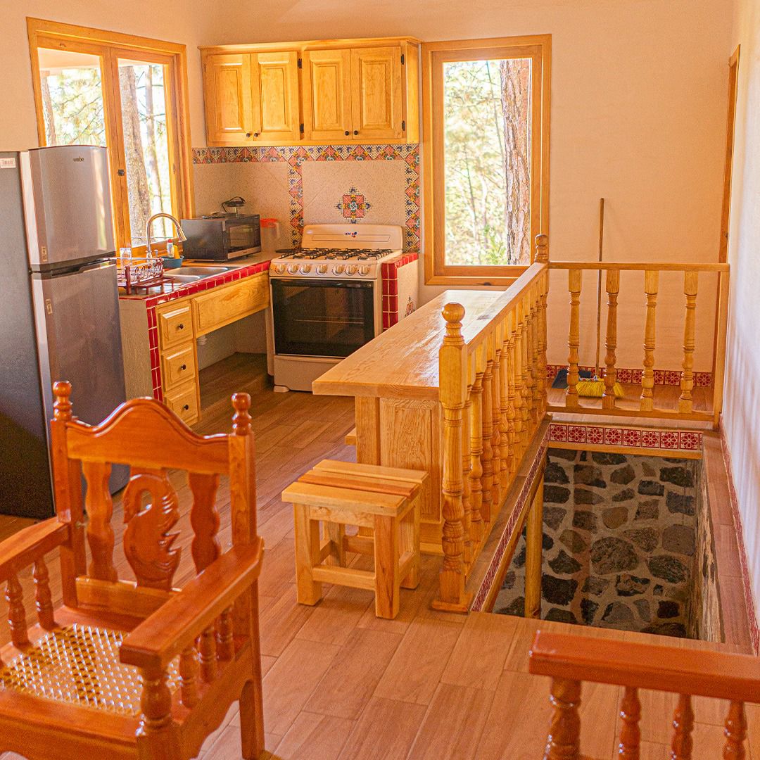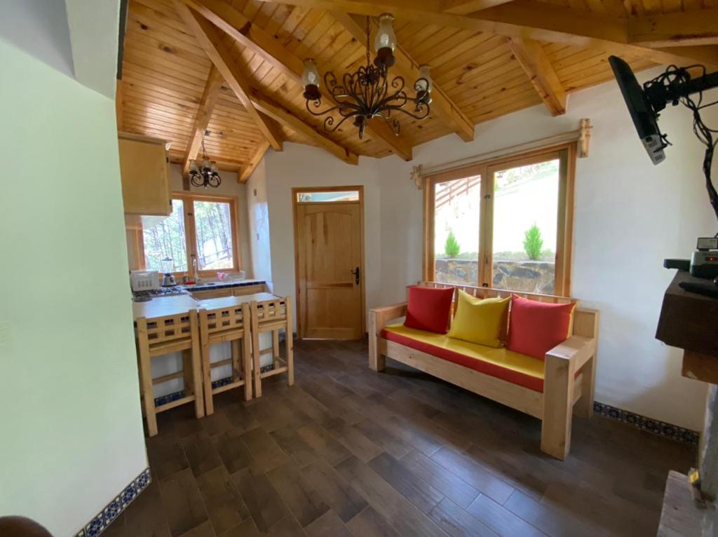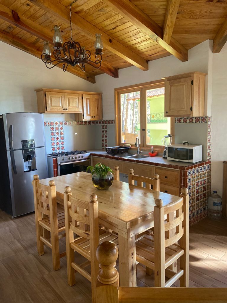 Sala, Barra de Desayunador, chimenea, dos baños completos, balcón, zona de jardín, jacuzzi hidro-masaje Cocina equipada (refrigerador, licuadora, micro-ondas, utensilios básicos para cocinar y comer), carga de leña, TV-SKY, toallas, cobertores, jabón, shampoo, agua purificada, Recamara Principal: Cama King Size. Segunda Recamara: Dos camas de Colchones individuales.