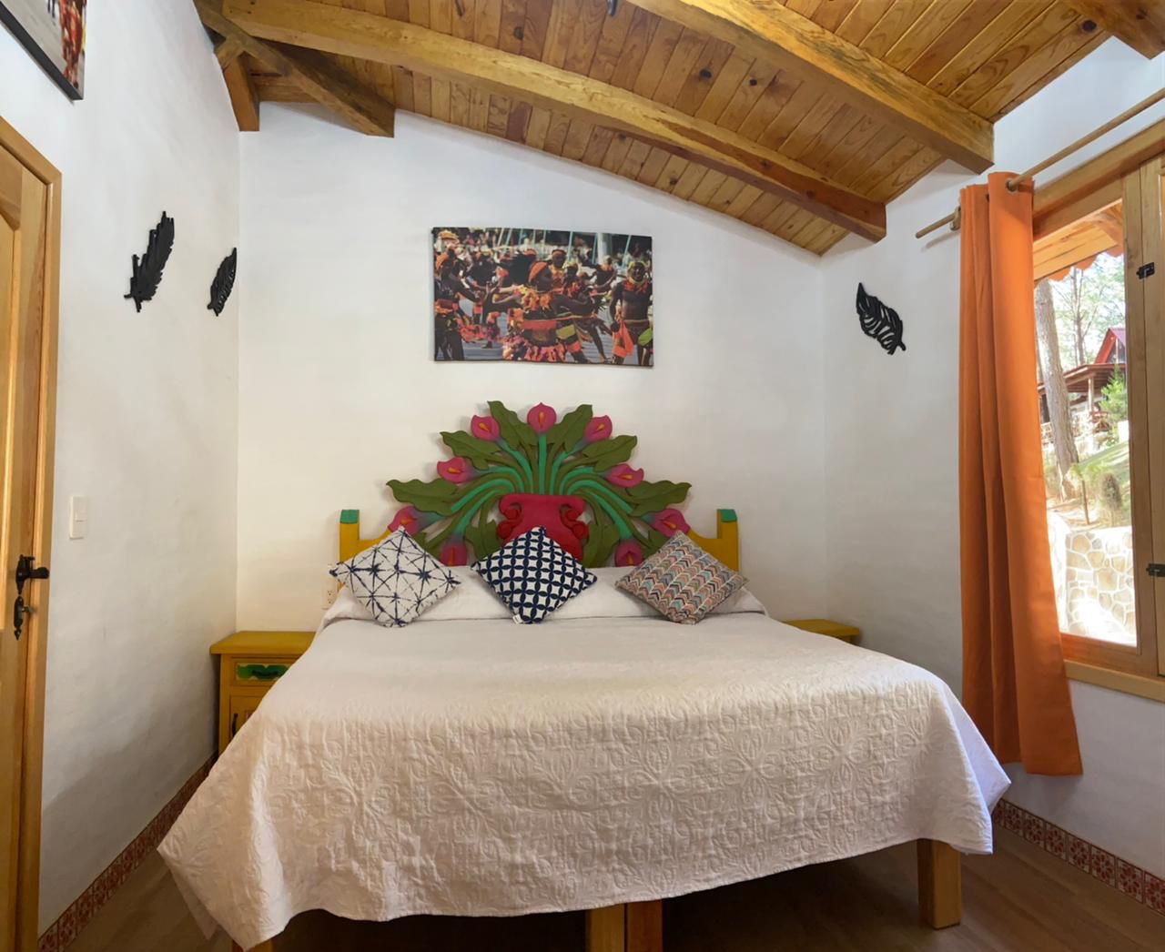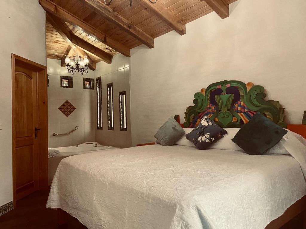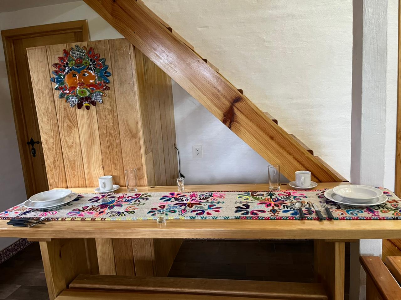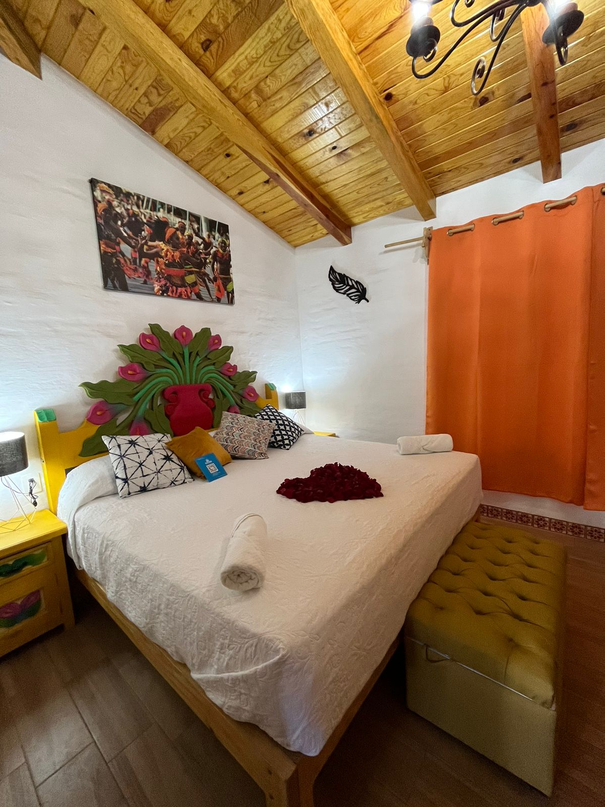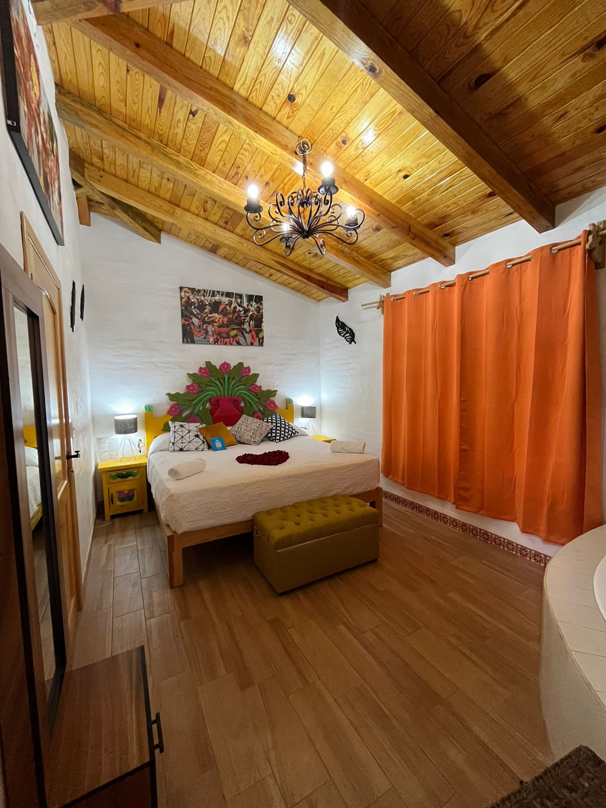 Sala, Barra de Desayunador, chimenea, dos baños completos, balcón, zona de jardín, jacuzzi hidro-masaje Cocina equipada (refrigerador, licuadora, micro-ondas, utensilios básicos para cocinar y comer), carga de leña, TV-SKY, toallas, cobertores, jabón, shampoo, agua purificada, Recamara Principal: Cama King Size. Segunda Recamara: Dos camas de Colchones individuales.