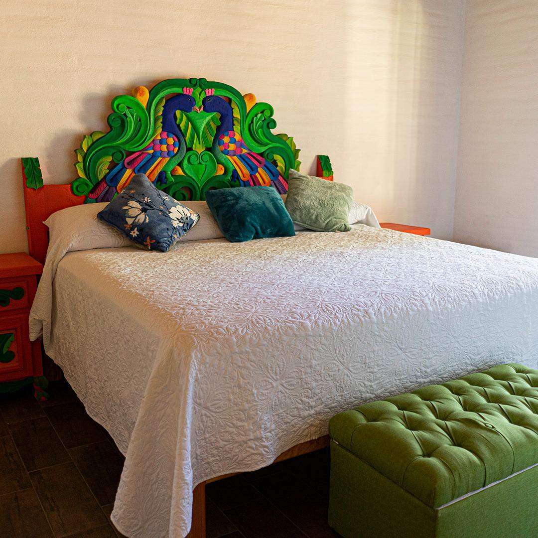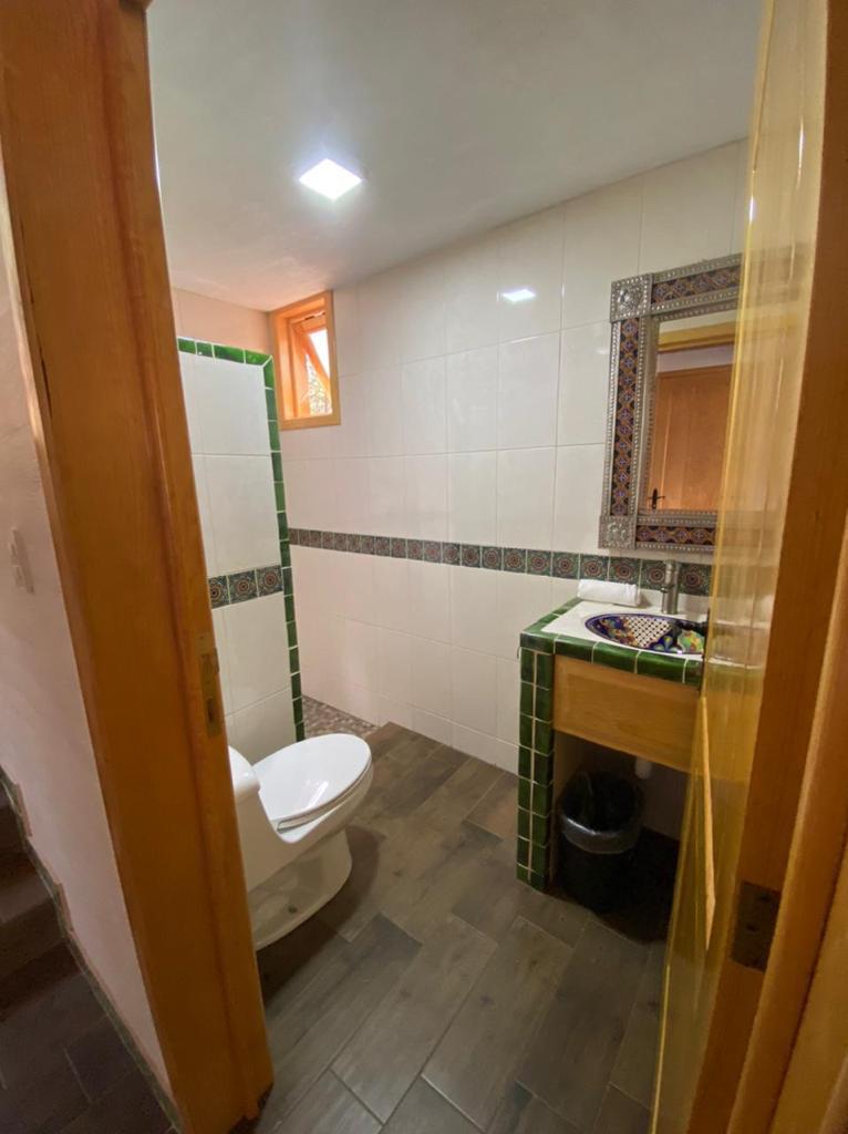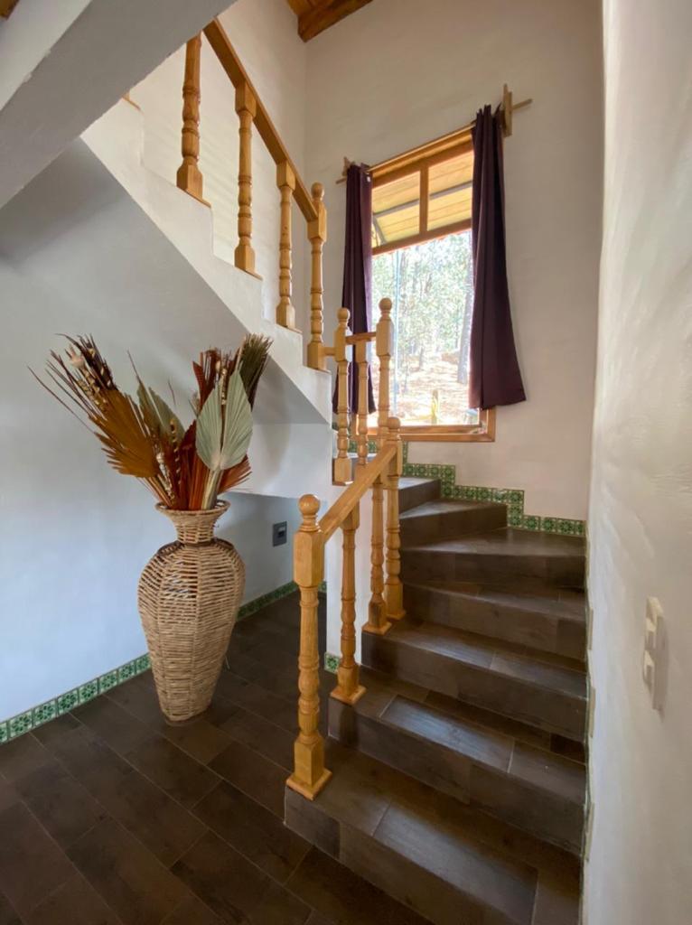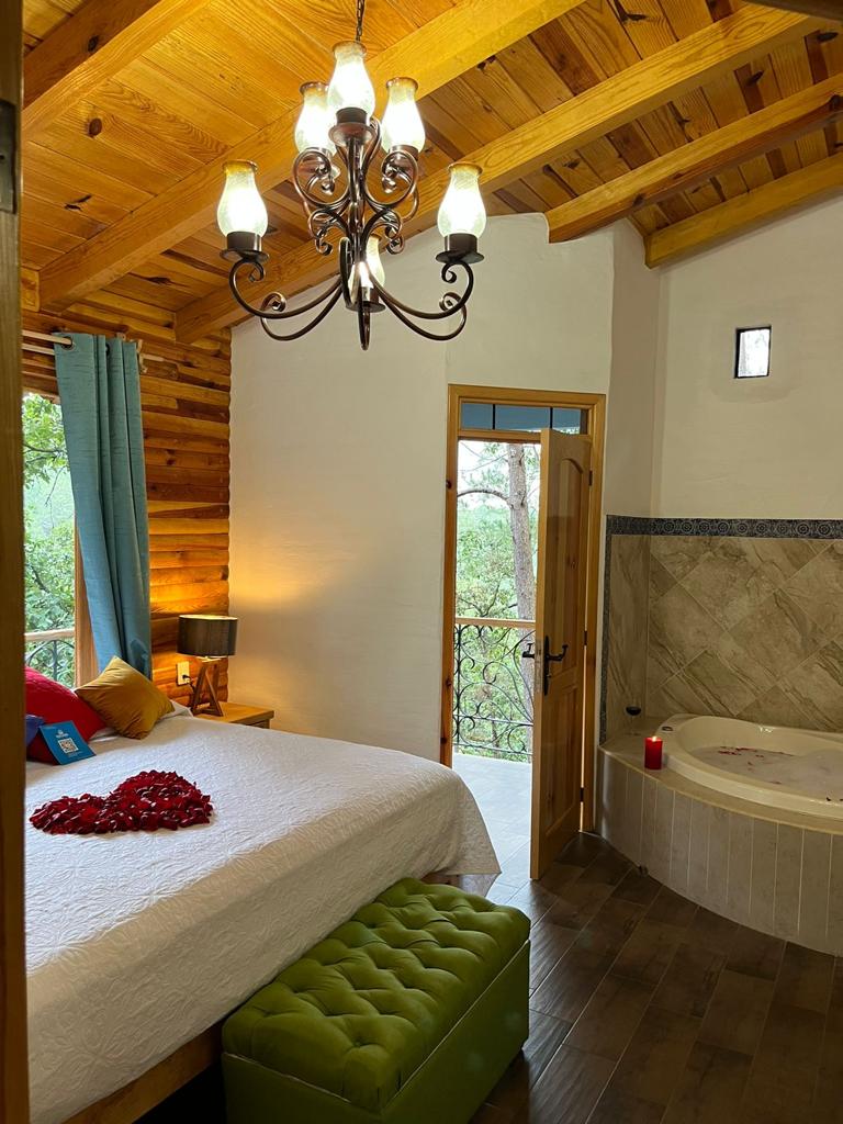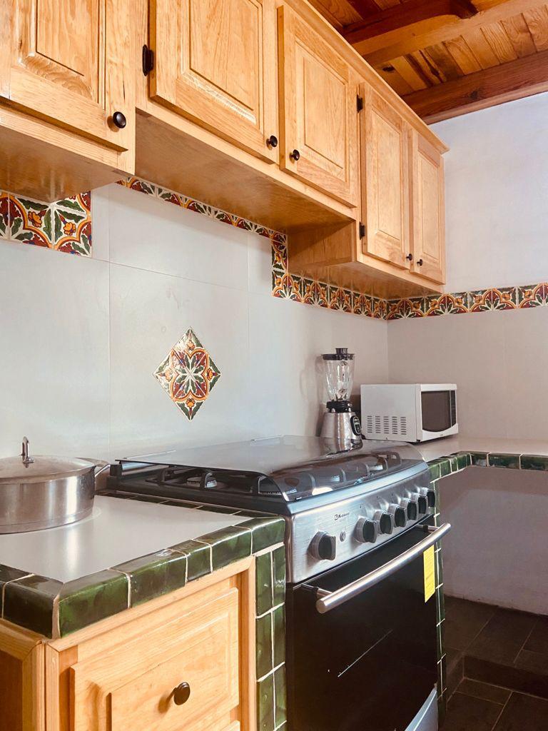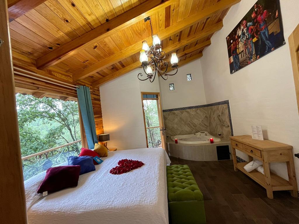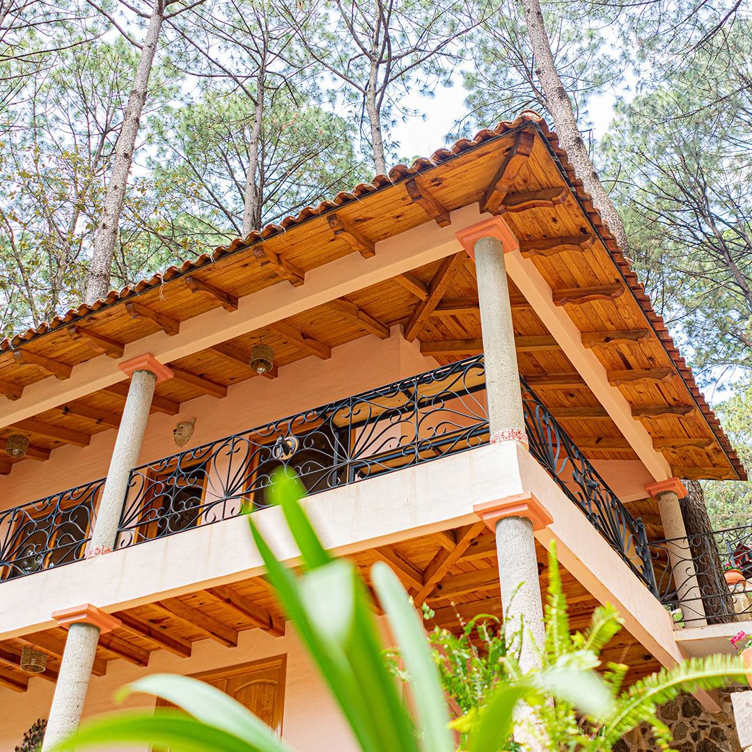 Sala, Barra de Desayunador, chimenea, dos baños completos, balcón, zona de jardín, jacuzzi hidro-masaje Cocina equipada (refrigerador, licuadora, micro-ondas, utensilios básicos para cocinar y comer), carga de leña, TV-SKY, toallas, cobertores, jabón, shampoo, agua purificada, Recamara Principal: Cama King Size. Segunda Recamara: Dos camas de Colchones individuales.