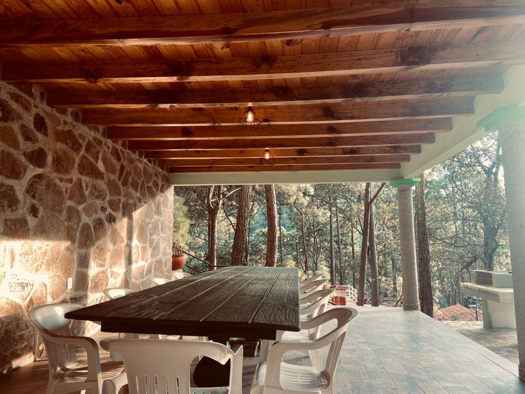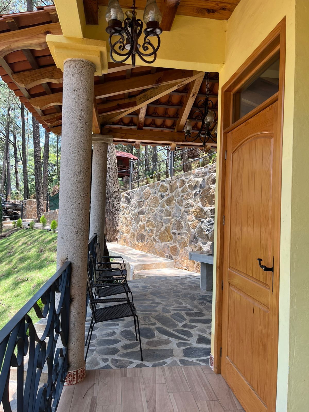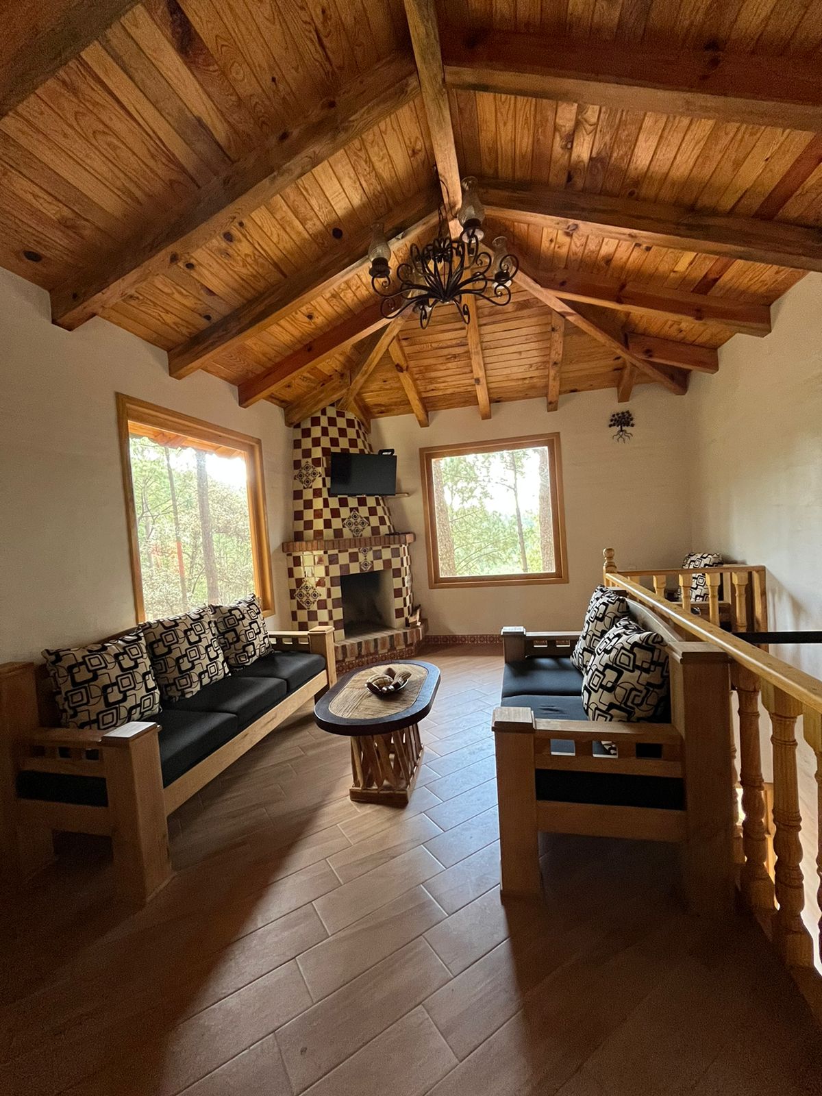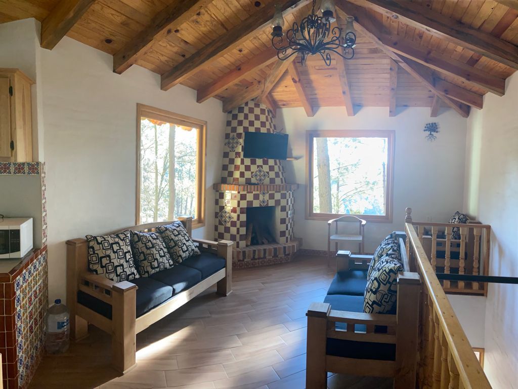 Sala, comedor, chimenea, dos baños completos, terraza, asador, zona de jardín, jacuzzi hidro-masaje. Cocina equipada (refrigerador, licuadora, micro-ondas, utensilios básicos para cocinar y comer), carga de leña, TV-SKY,, toallas, cobertores, jabón, shampoo, agua purificada, Recamara Principal: Cama King Size. Segunda Recamara: Dos Literas de Colchones Matrimoniales y una Cama Individual.