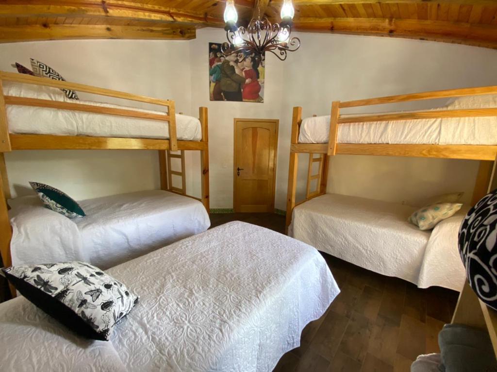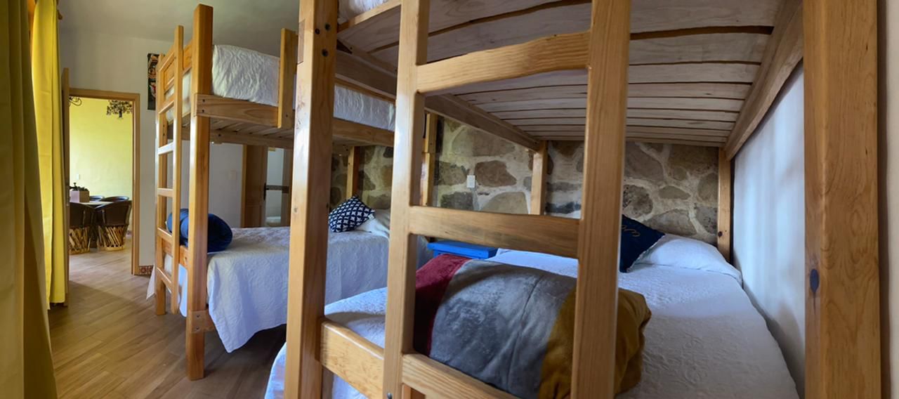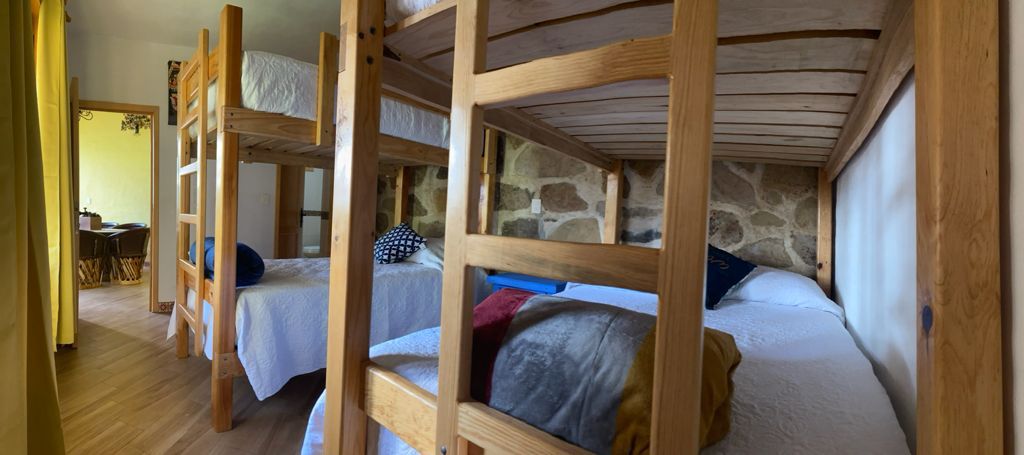 Sala, comedor, chimenea, dos baños completos, terraza asador, zona de jardín, jacuzzi hidro-masaje Cocina equipada (refrigerador, licuadora, micro-ondas, utensilios básicos para cocinar y comer), carga de leña, TV-SKY, toallas, cobertores, jabón, shampoo, agua purificada, Recamara Principal: Cama King Size. Segunda Recamara: Una Litera de Colchones Matrimoniales y una Litera de Colchones Individuales.