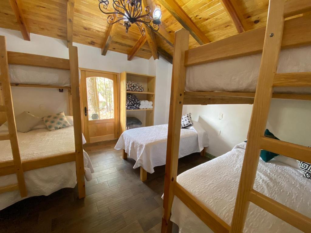 Sala, comedor, chimenea, dos baños completos, amplio balcón, terraza asador, zona de jardín, jacuzzi hidro-masaje Cocina equipada (refrigerador, licuadora, micro-ondas, utensilios básicos para cocinar y comer), carga de leña,, TV-SKY,, toallas, cobertores, jabón, shampoo, agua purificada, Recamara Principal: Cama King Size. Segunda Recamara: Dos literas de Colchones individuales y una Cama Matrimonial. Tercer Recamara: Tapanco con 2 camas de Colchones Individuales.