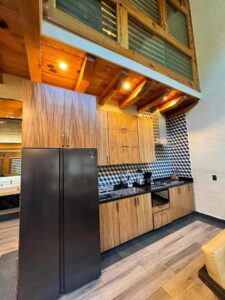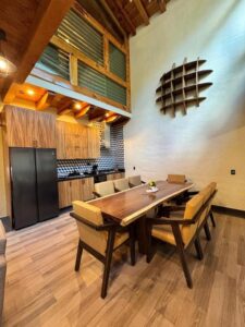 Cocina totalmente equipada que incluye: Estufa, Microondas, Refrigerador, Cafetera, Licuadora, Cubiertos y utensilios de cocina básicos. También cuenta con: Wifi Starlink, TV en la recámara y sala, Servicio de agua caliente, Red de descanso, Chimenea, Sala, Barra desayunadora, 1 baño completo con jacuzzy, Terraza techada e iluminada con su comedor exterior, Asador, Estacionamiento. Pet Friendly (Perímetro completamente cercado).