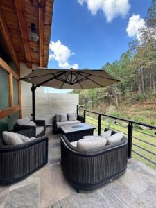 Sala de estar al exterior en planta alta con vista al bosque y sombrilla