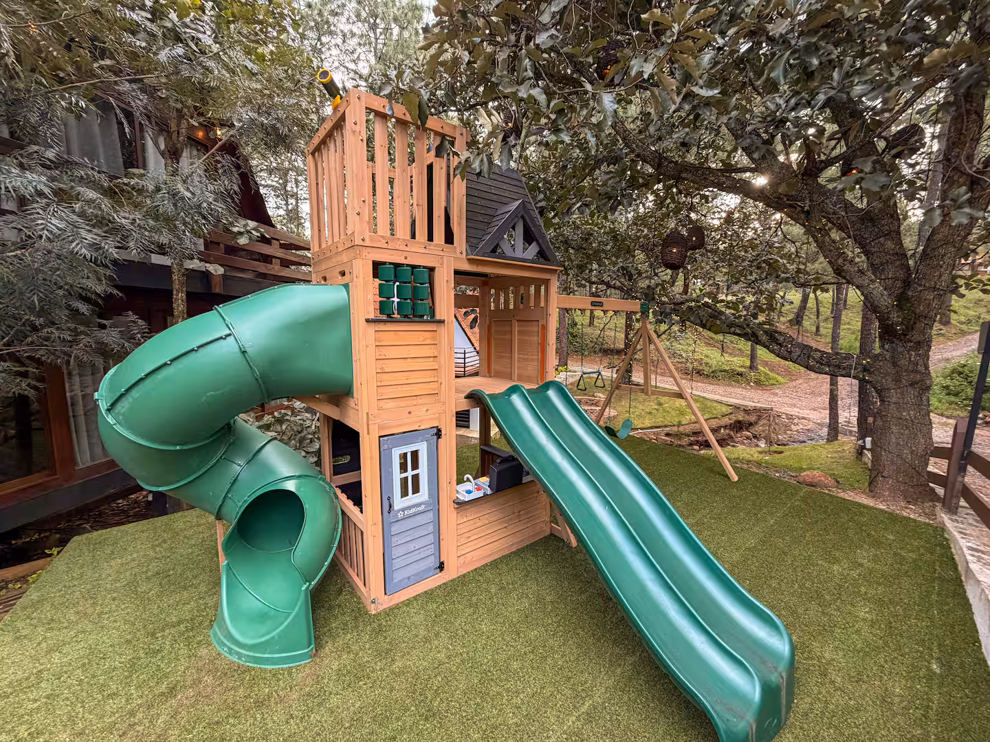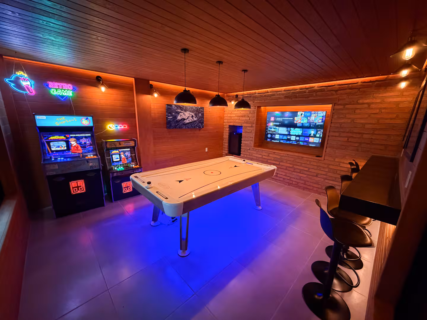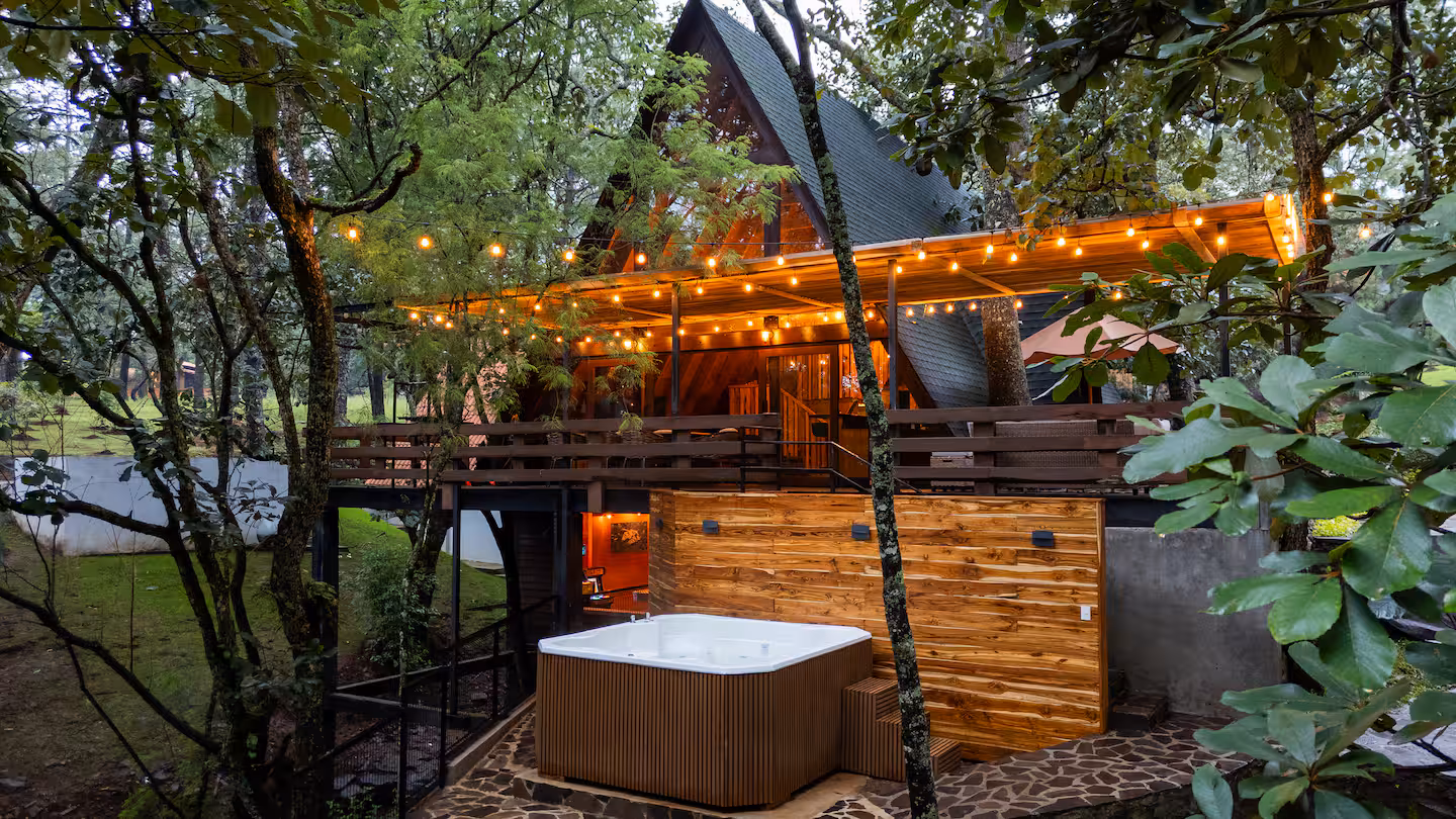 Afuera, el jacuzzi para hasta 8 personas se rodea de pinos y, en temporada de lluvias, corre un arroyito bajo la cabaña: atmósfera 100% Mazamitla. Adentro, el cuarto de juegos quedó brutal: mesa de hockey de aire, dos maquinitas arcade, TV para los partidos y barra con minibar.