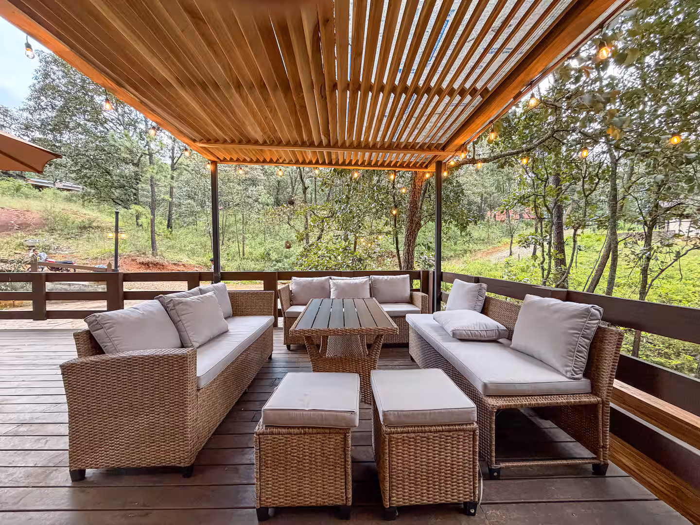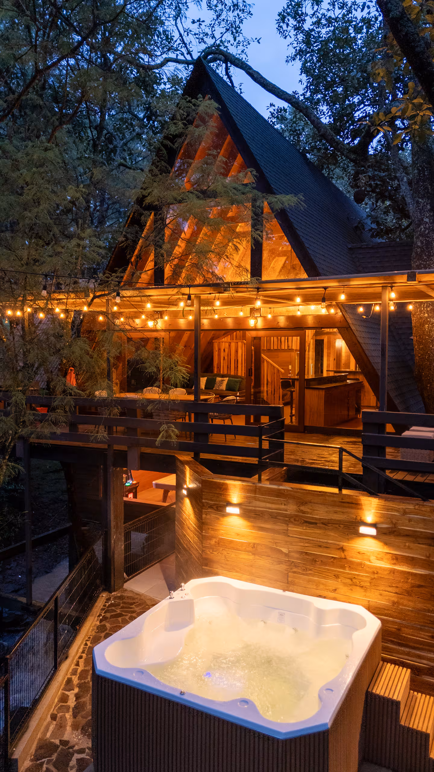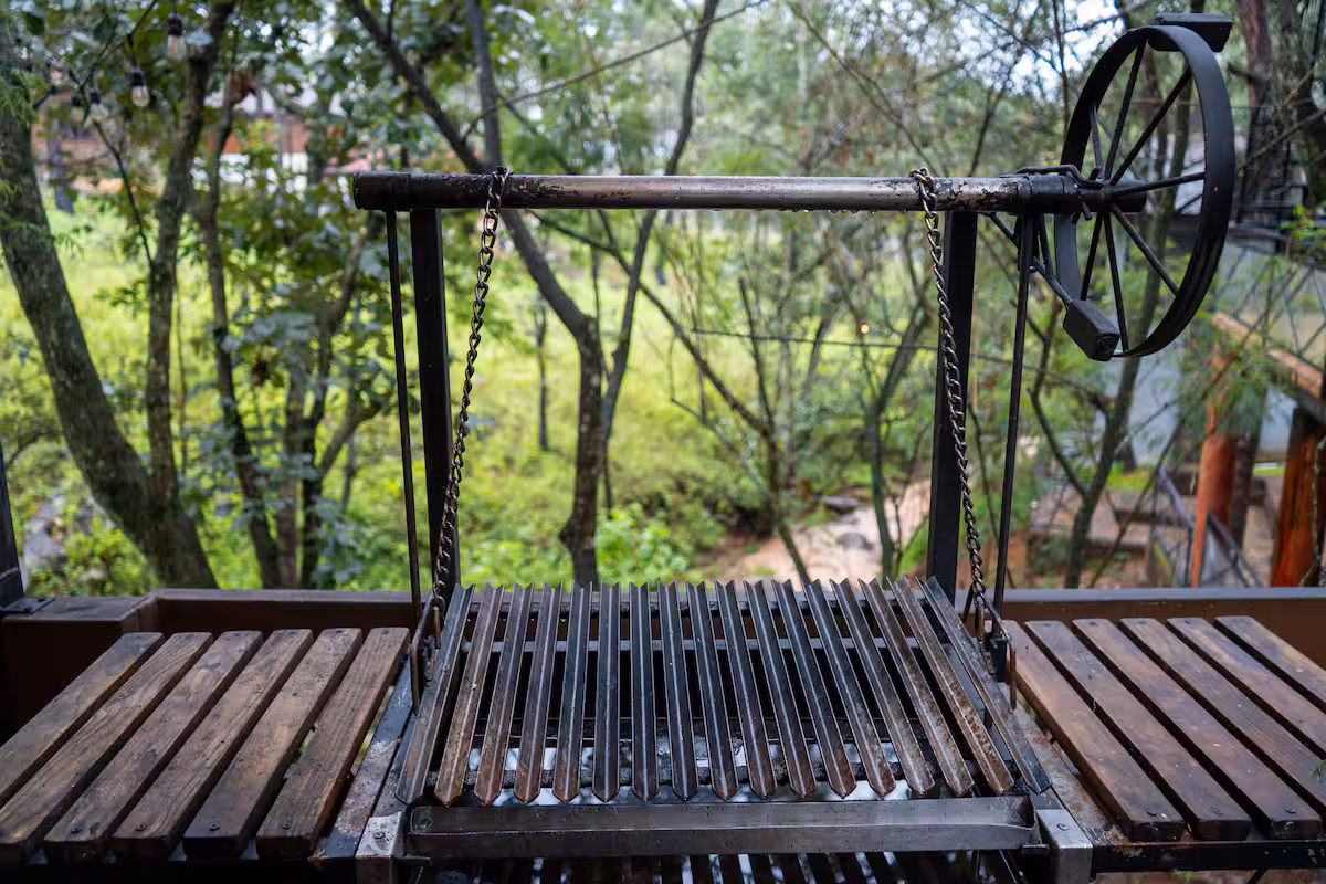 Afuera, el jacuzzi para hasta 8 personas se rodea de pinos y, en temporada de lluvias, corre un arroyito bajo la cabaña: atmósfera 100% Mazamitla. Adentro, el cuarto de juegos quedó brutal: mesa de hockey de aire, dos maquinitas arcade, TV para los partidos y barra con minibar.