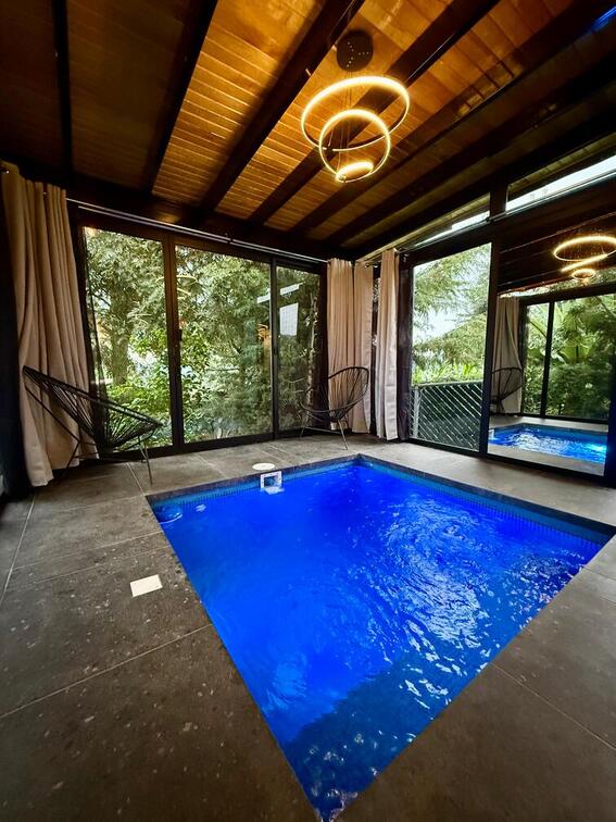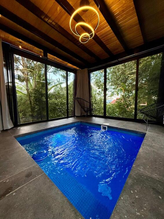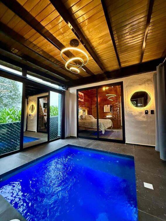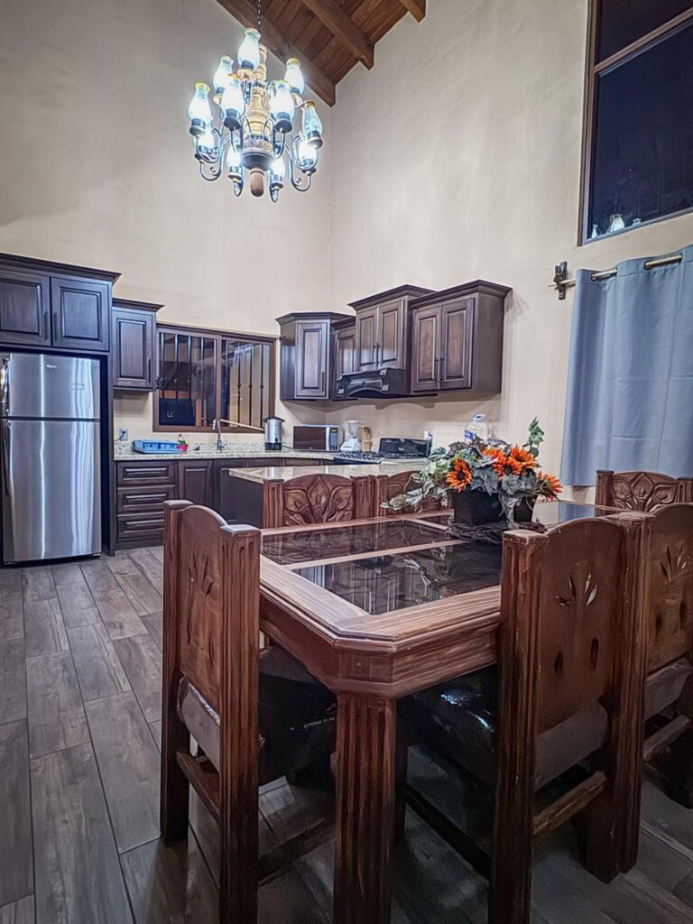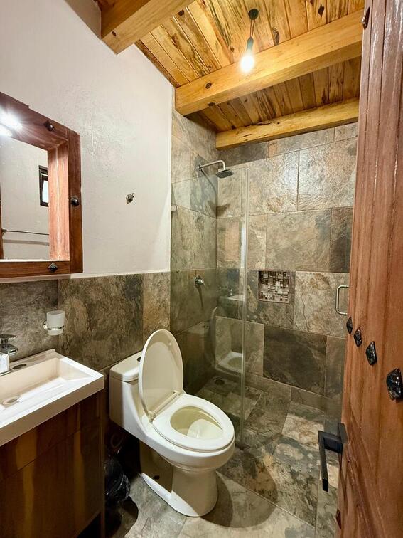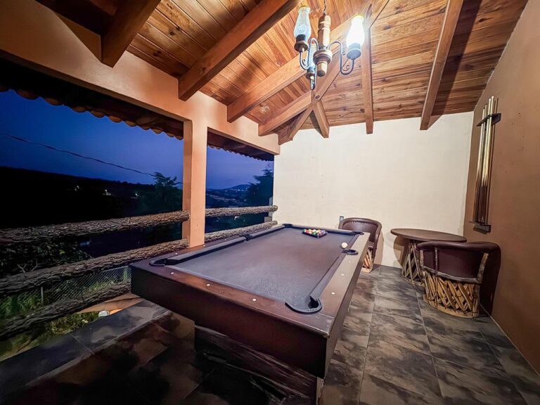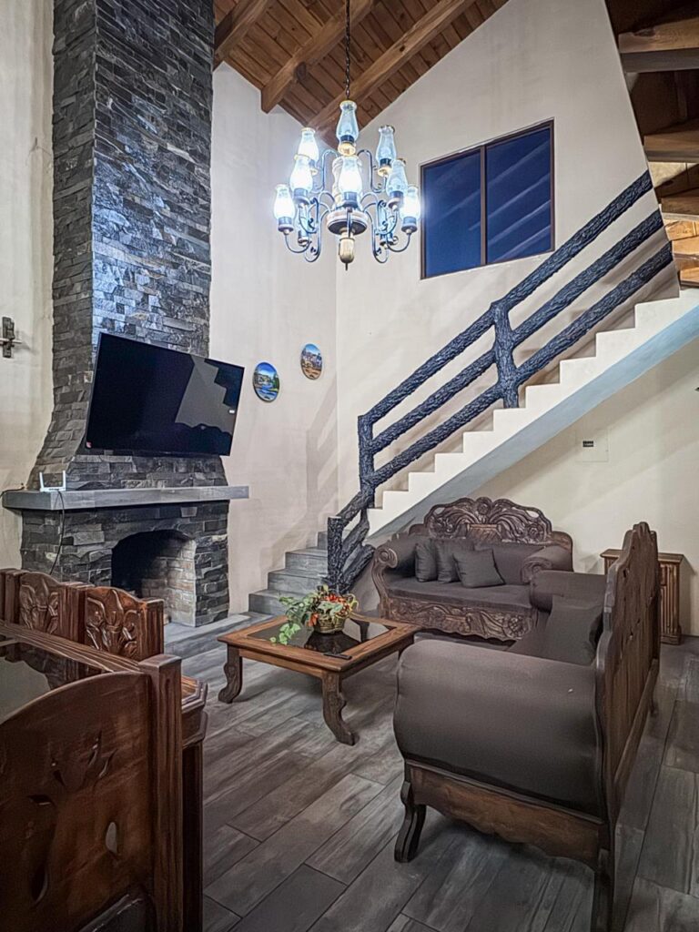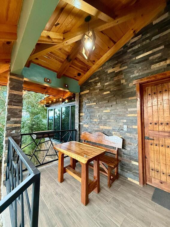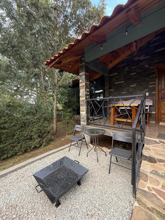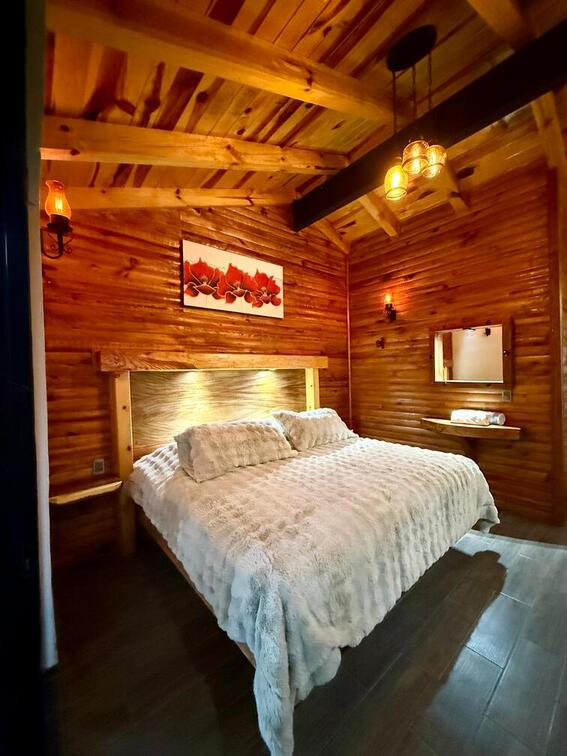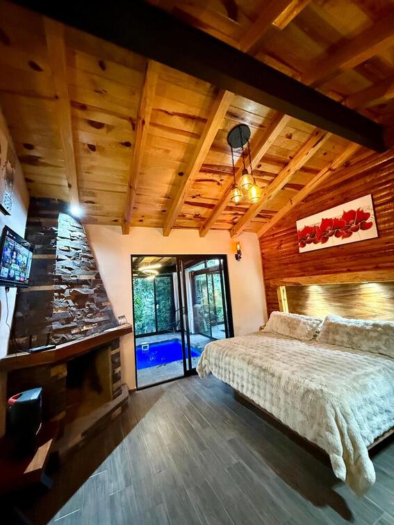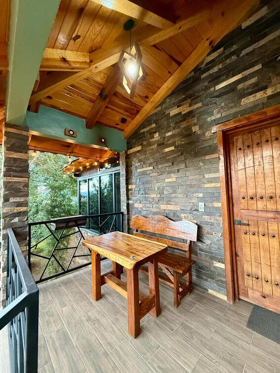 Cocina totalmente equipada con electrodomésticos y loza, con barra y espacio de comedor. Terraza en la segunda planta con 2 juegos de equipales, sala acogedora con Smart Tv, internet Starlink , bocina, mesa de billar y chimenea. Senador fuera de la cabaña con equípales y brasero.